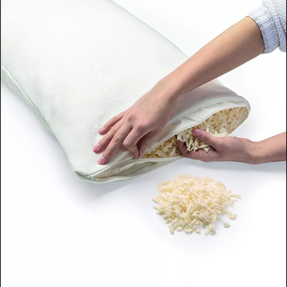 Bei Füllkissen lässt sich das Füllmaterial individuell anpassen – z. B. Flocken oder Stäbchen aus Naturlatex, Zirbenholz-Flocken etc.